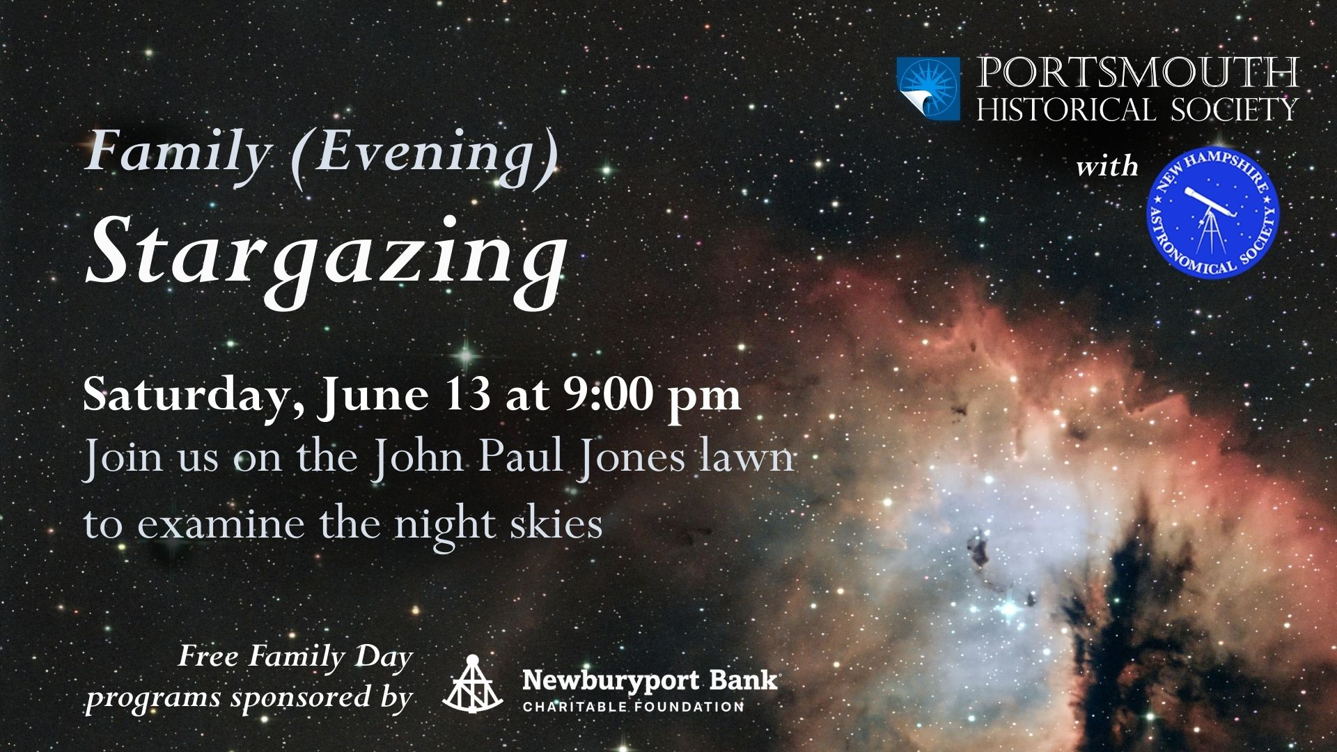 « All Events Family Evening: Stargazing June 13, 9:00 pm - 10:00 pm « Women of Portsmouth Walking Tour US@250: Big Watch at Strawbery Banke » Join us for a night looking up at the sky RSVP to our Family Day Thank you to our Family Day sponsor for making this free, family-friendly event possible: Add to calendar Google Calendar iCalendar Outlook 365 Outlook Live Details Date: June 13 Time: 9:00 pm - 10:00 pm Event Categories: Education Programs, John Paul Jones Programs Event Tags:Astronomy, Family Day, Free Family Fun, Night Sky, Portsmouth NH, Stargazing Organizer Portsmouth Historical Society Phone 603-436-8433 View Organizer Website Venue John Paul Jones House 43 Middle Street Portsmouth, NH 03801 United States + Google Map View Venue Website Related Events Historic Portsmouth Walking Tours (May-Oct) May 1 - June 30 Spring Auction May 7, 5:30 pm - 7:30 pm Family Day: Portsmouth on Foot May 9, 11:00 am - 12:00 pm