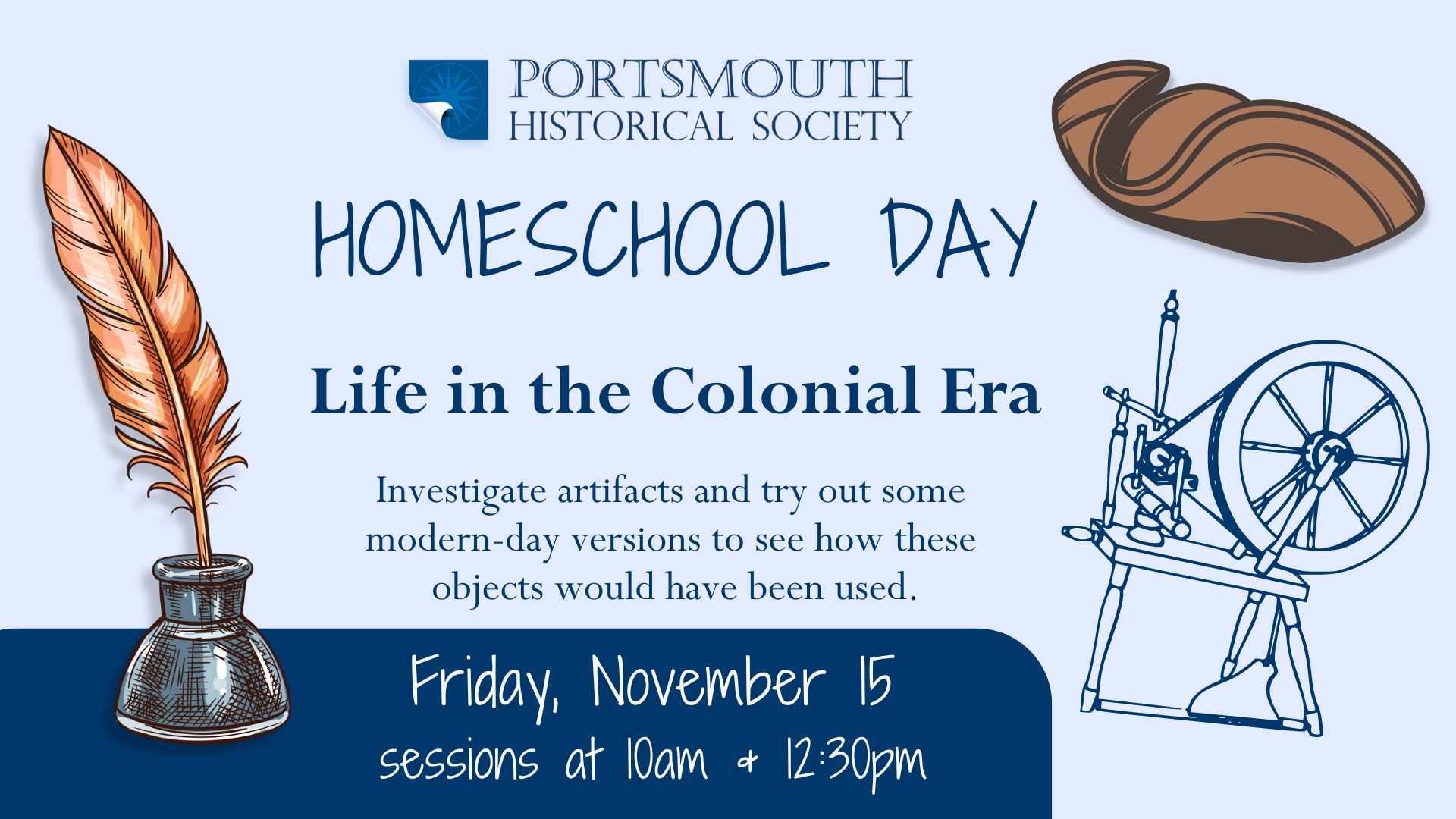 « All Events This event has passed. Portsmouth History Homeschool Program November 15, 2024, 10:00 am - 2:00 pm « Intro to Pastel Gingerbread Participant Registration Ends » How did the people of Portsmouth’s past live? Find out at our homeschool programs. Register for the Homeschool History Program! Add to calendar Google Calendar iCalendar Outlook 365 Outlook Live Details Date: November 15, 2024 Time: 10:00 am - 2:00 pm Event Category: Education Programs Event Tags:Colonial America, Homeschool, Indigenous History, John Paul Jones Historic House, Museum visit, Portsmouth NH Organizer Portsmouth Historical Society Phone 603-436-8433 View Organizer Website Venue Portsmouth Historical Society at 10 Middle Street 10 Middle Street Portsmouth, NH 01801 United States + Google Map Phone 603.436.8433 View Venue Website Related Events Historic Portsmouth Walking Tours (May-Oct) May 1 - June 30 Loyalist to Liberty Walking Tour May 1, 2:30 pm - 4:00 pm Loyalist to Liberty Walking Tour May 1, 2:30 pm - 4:00 pm