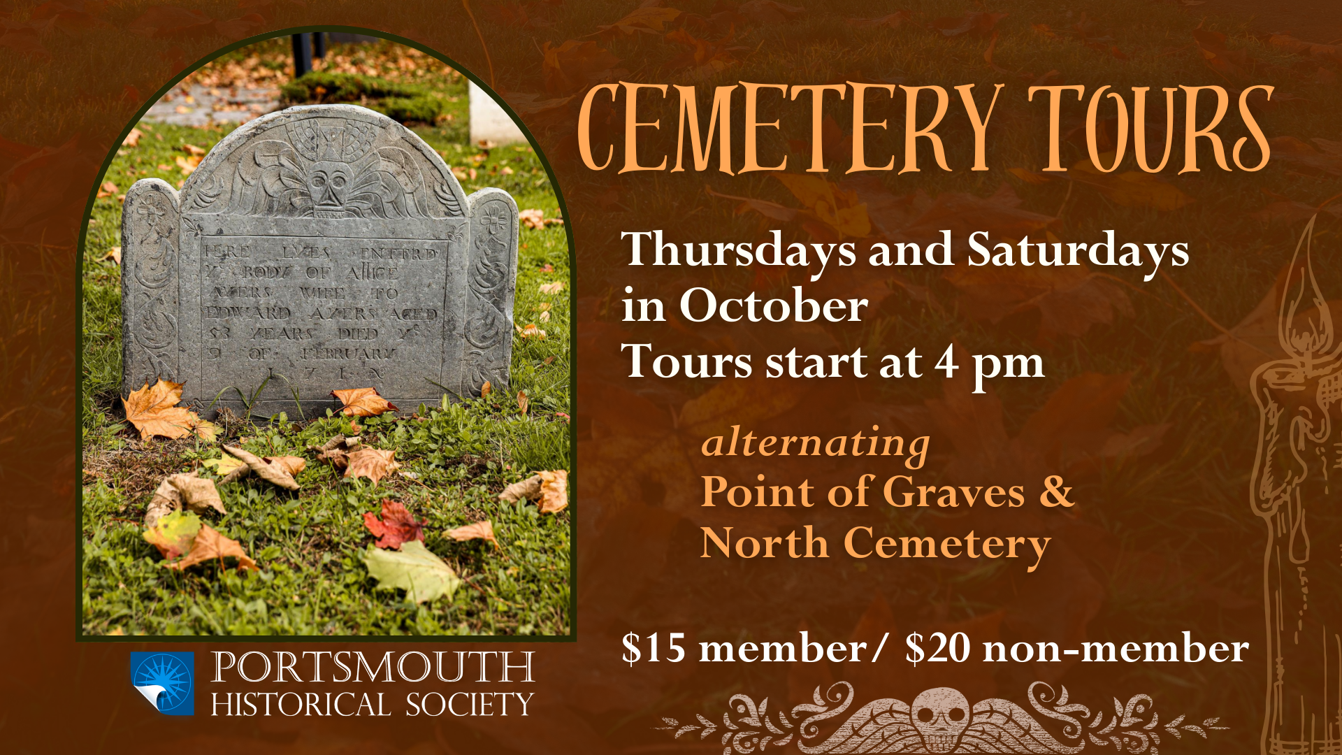 « All Events This event has passed. Cemetery Tours: Point of Graves October 18, 2025, 4:00 pm - 5:30 pm « Loyalist to Liberty Walking Tour LGBTQ+ Walking Tour » Take a walk through Portsmouth cemeteries to learn the meaningful, odd, and sometimes spooky traditions of Portsmouth’s past Register for our Cemetery Walking Tour Add to calendar Google Calendar iCalendar Outlook 365 Outlook Live Details Date: October 18, 2025 Time: 4:00 pm - 5:30 pm Event Categories: Education Programs, Walking Tours Event Tags:Colonial History, Momento Mori, North Cemetery, October, Point of Graves, Portsmouth NH, Spooky Season, Walking Tour Organizer Portsmouth Historical Society Phone 603-436-8433 View Organizer Website Venue Point of Graves 1-199 Mechanic St Portsmouth, NH 03801 United States + Google Map Phone 6034368433 Related Events Historic Portsmouth Walking Tours (May-Oct) May 1 - June 30 Loyalist to Liberty Walking Tour May 1, 2:30 pm - 4:00 pm Loyalist to Liberty Walking Tour May 1, 2:30 pm - 4:00 pm